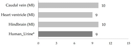 Total number of detected 4F-MDMB-BINACA metabolites following administration of the SC into ZF larvae through different microinjection routes. All results from ZF larvae in this study are represented as the mean value of peak numbers from triplicates of 30 pooled larvae. * Human urine data represent published integrated data of metabolites that were detected at least twice in all studied urine samples [27,32,34,35]. (MI: microinjection).