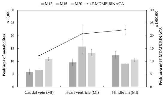 Moreover, comparing the relative abundance of the three major ZF metabolites, their peak intensities varied depending on the site of microinjection. M20 was most abundant after caudal vein injection, M15 after heart ventricle injection, and M12 after injecting 4F-MDMB-BINACA into the hindbrain (Figure 3). The peak area of M20 was similar in all three microinjected ZF samples. However, the observed differences were mostly below statistical significance with p > 0.05. Overall, peak intensities of the parent compound and its three major metabolites were lowest after injection into the ZF caudal vein, and this finding was also confirmed for the three minor metabolites M4, M11, and M25 (Supplementary Figure S1). This result can possibly be explained by the fast circulation of the parent compound as soon as it is injected into the caudal vein. This, in turn, might cause fast metabolism and excretion. However, the overall metabolite pattern seems to be barely influenced by the target organ of microinjection as direct administration routes for 4F-MDMB-BINACA (Table 1 and Figure 2). In contrast to the previously studied cannabinoid 7′N-5F-ADB, direct injection of 4F-MDMB-BINACA into ZF larvae did not increase the number of detected metabolites compared to waterborne exposure [28].
