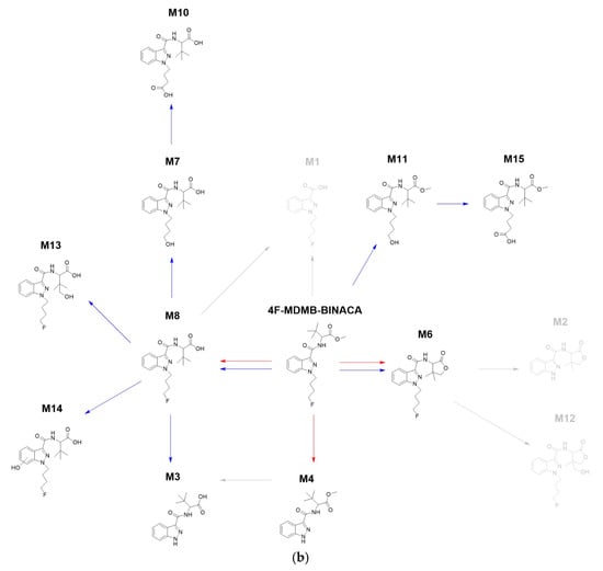 The main phase I metabolic pathway of 4F-MDMB-BINACA based on findings in the ZF larvae model (a) and from human screening (b). In panel (b), red arrows indicate results from human blood samples, and blue arrows indicate results from human urine samples. Metabolites in blue represent molecules not detected in the respective model. Four metabolites (M7, M8, M13, and M14) were not detected in the microinjected ZF larvae despite the detection of M3 and M10 as their following sequential metabolites. In contrast, terminal metabolites M1, M2, and M12 and a cross-connection between M3 and M4 were not found in human samples.