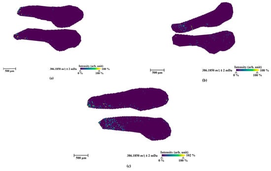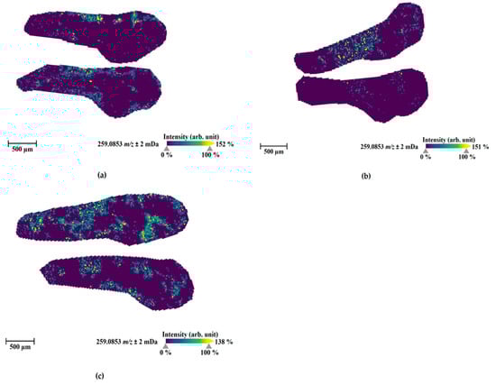 MSI is a powerful tool and label-free technology that enables visualization of the spatial distribution of molecules in biological specimens in a single experiment [43,44,45,46,47]. In combination with a high-resolution mass spectrometer such as Fourier-transform ion cyclotron resonance (FT-ICR), MSI can depict the localization of molecules, which can be identified with high confidence. Moreover, MSI mapping of molecules of interest (e.g., drugs, metabolites, biomarkers) in biological tissues is critical for understanding their pharmacology [44,45]. In recent years, MALDI-MSI is becoming a more established tool in clinical practice and the pharmaceutical industry [45,46,47]. However, its application to ZF larvae is still limited, mainly due to challenging and critical steps of sample preparation. Nevertheless, we were previously able to generate spatial distribution images of 7′N-5F-ADB metabolites in ZF larvae by MALDI-FT-ICR [28].