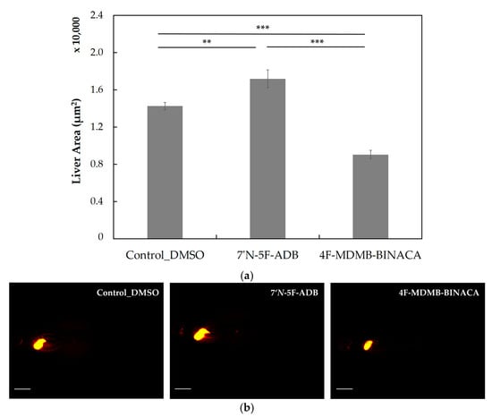 Liver size assessment (a) and red fluorescent liver morphologies (b) of transgenic ZF larvae (Tg(fabp10a:DsRed;elaA:EGFP)) treated by waterborne exposure with DMSO, 7′N-5F-ADB (50 µM), or 4F-MDMB-BINACA (25 µM) from 4 dpf to 5 dpf (n = 11–15). All data are represented by the mean ± standard error of the mean (s.e.m.) and p values were computed by one-way ANOVA (** p < 0.01, *** p < 0.001). Liver sizes were determined based on fluorescence microscopy images using ImageJ 1.53a. Scale bars: 500 µm.
