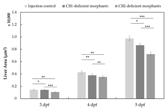 Following cnr1 and cnr2 gene knockdown in embryos of the Tg(fabp10a:DsRed; elaA:EGFP) ZF line, we assessed the liver size of morphants from 3 to 5 dpf (Figure 8). We observed small effects on the liver size already at 3 and 4 dpf, whereas the impact of CB1 and CB2 deficiency was most obvious at 5 dpf, and CB2-deficient morphants showed a significantly reduced liver area compared to the control group (mock injection with distilled water). The extent of liver size reduction in 5 dpf CB2-deficient morphants (26% reduction compared to control) was similar to that observed in 5 dpf larvae treated for 1 d with 4F-MDMB-BINACA (37% reduction compared to untreated control).