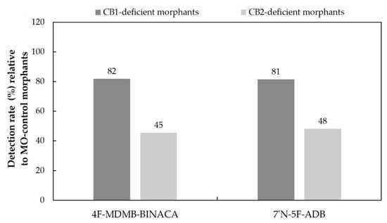 Comparison of the overall detection rates of phase I and phase II metabolites produced in CB1-deficient and CB2-deficient ZF larvae after waterborne exposure to 25 µM 4F-MDMB-BINACA and 50 µM 7′N-5F-ADB, respectively (n = 3). The detection rates were calculated based on the number of metabolites found in the respective control population (set to 100%).