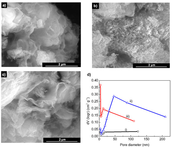 SEM micrographs of (a) GCN, (b) GCN-T-N, and (c) GCN-T. (d) Barrett–Joyner–Halenda pore volume distribution derived from the N2 adsorption isotherms of (i) GCN, (ii) GCN-T-N, and (iii) GCN-T at −196 °C.