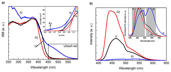 (a) DR UV–vis spectra (inset is shown the respective Tauc plots) and (b) PL spectra (inset is shown the normalized PL spectra) of (i) GCN, (ii) GCN-T-N, and (iii) GCN-T. Highlighted zones Z1 and Z2 indicate the two PL emission bands.