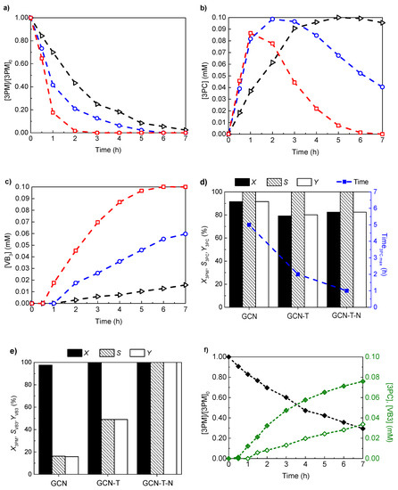 (a) Normalized 3PM, (b) 3PC, and (c) VB3 concentrations over 7 h of irradiation (λmax = 412 nm) using GCN (▷), GCN-T-N (□), and GCN-T (○) as catalysts. (d,e) X, S, and Y obtained for the photooxidation of 3PM into 3PC and VB3 at the maximum of their production, respectively. (f) Normalized 3PM (♦), 3PC (