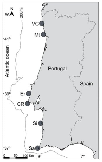 - Sousa, A.; Jacinto, D.; Penteado, N.; Martins, P.; Fernandes, J.; Silva, T.; Castro, J.J.; Cruz, T. Patterns of Distribution and Abundance of the Stalked Barnacle (Pollicipes Pollicipes) in the Central and Southwest Coast of Continental Portugal. J. Sea Res. 2013, 83, 187–194. [Google Scholar] [CrossRef]