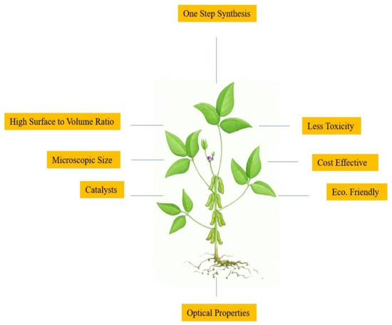 Among modern technologies, nanotechnology, which deals with nanoscale materials ranging from 1 nm to 100 nm, is immensely popular due to its vast applications [1,2,3,4]. Professor Norio Taniguichi from Tokyo University of Science first introduced the term “nanotechnology” in 1974 [5]. Today, nanoparticles (NPs) are enlisted by experts in order to increase the yield and production, and their quality, in the manufacture of secondary metabolites, antioxidants, and as agents showing antimicrobial properties in plants [6,7,8]. Due to the novelty of engineered nanoparticles (ENPs), nanotechnology is being widely applied in all fields of medicine, such as in therapy for infections, allergies, diabetes, inflammatory issues and anti-cancer therapy [9,10,11,12]. Nanoparticles can also be used in textiles, food packing, household products, medical devices and in personal healthcare, due to their antifungal and antibacterial properties [13]. ENPs are also used for waste-water treatment [14]. In effect, this technology is becoming the need of the hour for many reasons, as it is most important for the production of device manufacturing at the level of gene or molecule. Further, this is marked as a multidisciplinary field of science, which has undergone numerous important developments [15]. Nanotechnology is also very important for the development and synthesis of new products for science, having a number of possible products and outcomes for the advancement of medicine. It is also helpful in the diagnosis of different diseases, for drug delivery and applications in bio-imaging and bio-sensing [16,17,18,19]. Nanotechnology is the scientific wonder of the modern era, having a broad spectrum and vast applications in numerous disciplines, especially in the domains of biology, physics and chemistry [20]. The term green nanotechnology is derived from green chemistry. The word “green” actually refers to the origin of substances from plants. Plants have been under consideration for many years, and now they have become the principal component in the manufacture of various nanoparticles [21]. Nanoparticles from plants are eco-friendly, risk-free, cost-effective, in a single one-pot protocol and time-efficient, and they have no high physical requirements for their formation. This is also associated with the vast applications of green engineering (Figure 1) [22,23].