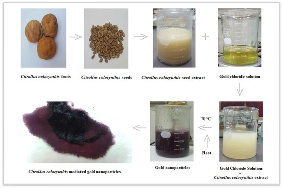 Seeds of Citrullus colocynthis, chloroauric acid, methanol, ethanol, HCl, HNO3, distilled water, Millipore water (Merck Millipore, Burlington, MA, USA), beakers, measuring cylinder, funnel, thermometer, pH meter, filter paper, water bath, Falcon tubes, Eppendorf tubes, centrifuge machine, lyophilizer and many others were used for analytical grades. The Millipore water used as solvent throughout the reaction and preparation procedures was obtained by filtering through Filter Tek with 0.45 µm pore size. All the glassware used in the synthesis process was thoroughly washed thrice with aqua regia (3 parts HCl and 1 part HNO3), rinsed with highly purified water and dried in the hot air oven.