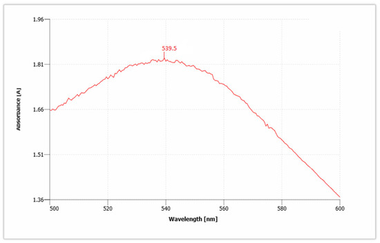 AuNPs have unique optical properties that are sensitive to shape and size, and also have a specific range of absorbance. Ultraviolet-Visible (UV-Vis) spectroscopy is used to check the SPR spectra of AuNPs. The UV absorbance spectra for synthesized AuNPs from C. colocynthis seed extract is shown in Figure 5. The wavelength for Citrullus colocynthis mediated AuNPs showed a maximum peak at 539.5 nm in accordance with the previous literature [45]. This confirms the presence of AuNPs, because AuNPs showed specific range of absorbance as compared to bulk that ranges between 500 nm and 600 nm. Our recent study is supported by previous findings [46,47]. Given that the spectra of AuNPs showed maximum surface plasmon response (SPR) between 531.5 and 543.5 nm that clearly showed different-sized nanoparticles are formed and broad peak of UV-Vis spectroscopy showed thickness in the gold deposited nanoparticles [48,49].