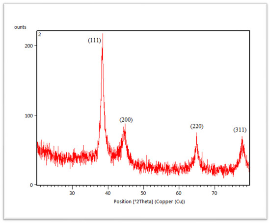 Another technique used for characterization is XRD. The pattern of XRD demonstrates the peak intensity, shape, position and size of the nanoparticles that confirmed the purity and formation of synthesized nanoparticles. The XRD pattern of AuNPs (Figure 6) has also declared 4 diffraction peaks at 2theta = 38°, 44°, 64° and 77° are at (111), (200), (220) and (311) plane indexing face centered cubic (FCC) structure [67]. This revealed the crystalline nature of AuNPs [68,69].