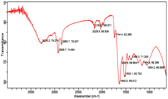 Fourier Transform Infrared Spectroscopy Analysis (FTIR) was carried out to identify the functional group of active components, based on the peak value in the region of infrared radiation [53]. The results of FTIR peak values and functional groups are represented in Table 2, and the FTIR spectrum profile is illustrated in Figure 8, which represents strong bands of FTIR spectrum. The FTIR spectrum of Citrullus colocynthis-mediated AuNPs indicates the presence of various chemical groups’ residues that co-exist with the AuNPs. FTIR spectrum confirmed the presence of alcohol, phenol, alkenes, alkyl halide, amino acids, carboxylic acid, aromatic and amines.