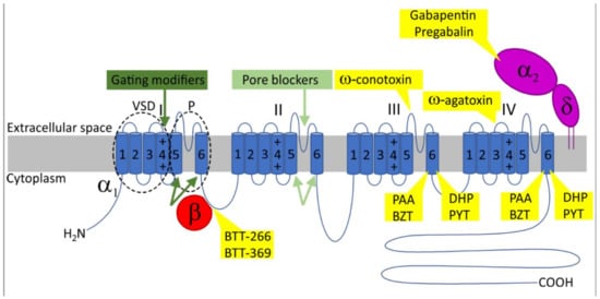 Gabapentin and pregabalin are used in clinical practice to treat focal and partial seizures [194]. Because these drugs bind to the CaVα2δ subunit, they induce several unwanted effects by targeting multiple VGCCs, irrespective of the CaVα1 isoform. Furthermore, in patients treated for neuropathic pain with drugs targeting VGCCs, such as benzodiazepines and opioids, the use of gabapentinoids is critical because of possible pharmacodynamic interactions [194].