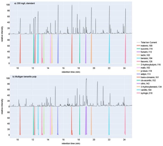 Example TIC chromatograms for (a) a 200 mg/L organic acid standard, and (b) a sample of Mulligan tamarillo pulp overlaid above the EIC chromatograms for each of the sixteen organic acids quantified here. The name of the organic acid for each EIC is followed by the m/z of the ion used for quantification.