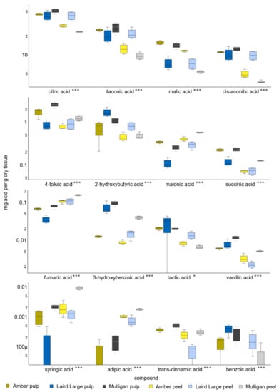 Boxplots showing the concentration of sixteen organic acids absolutely quantified in the peel and pulp of Amber, Laird’s Large and Mulligan tamarillo cultivars using MCF derivatization and GC-MS. The middle line of each box shows the median. Y-axis units are mg of organic acid per gram dry weight of tamarillo sample and are scaled logarithmically. Asterisks after the name indicate acids whose concentration differs significantly between cultivars and tissues. Single asterisks indicate p < 0.05 and triple asterisks p < 0.001.