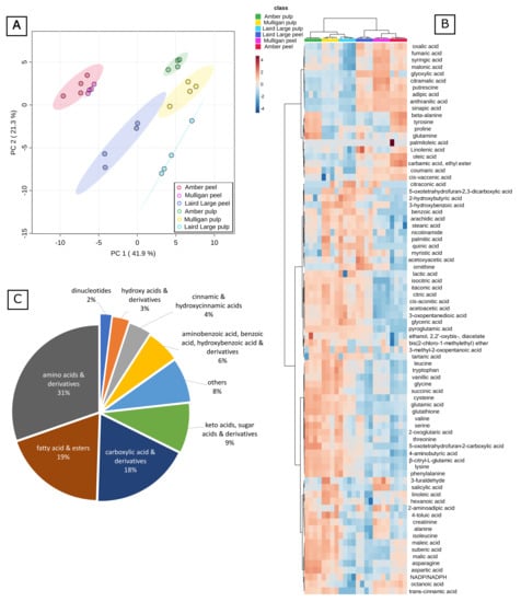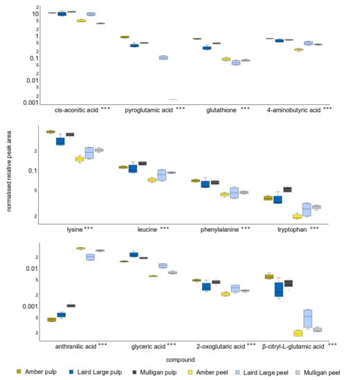 Of the twelve compounds responsible for differences between the metabolite profiles of pulp from the three cultivars and their peel, eleven were significantly different at p < 0.001 (Supplementary Table S2), whereas for citric acid p < 0.01. Concentrations of 4-aminobutyric acid (GABA), cis-aconitic acid, lysine, phenylalanine, glycine, isocitric acid and β-citryl-L-glutamic acid were typically elevated in pulp. The exceptions to this were citric acid, aconitic acid and 2-oxoglutaric acid concentrations in Laird’s Large pulp and peel samples, which were not significantly different. Only sinapic acid and anthranilic acid were depleted in pulp, relative to peel samples. Isocitric acid was not detected in Mulligan peel.