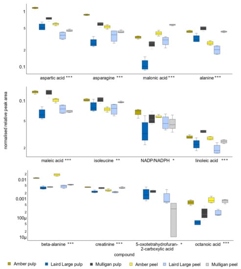 Relative peak area of the twelve compounds that contributed to the greatest differences on Principle Component Two, and so discriminating between the tissues of the Laird’s Large cultivar and the Amber and Mulligan ones. Y-axis units are peak area relative to recovery of the d4-alanine internal standard and are scaled logarithmically. Asterisks after the name indicate acids whose concentration differs significantly between cultivars and tissues. Single asterisks indicate p < 0.05, double indicates p < 0.01 and triple asterisks p < 0.001.