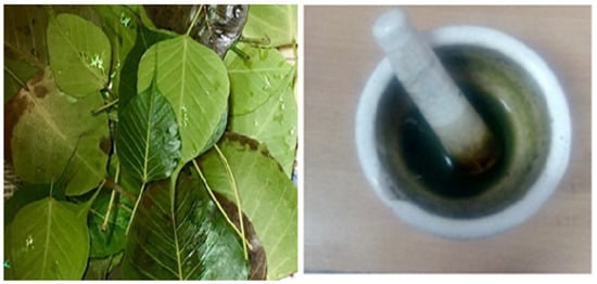 The samples were first visually examined for any kind of infection, spores, damage, discoloration, and distortion. Undamaged samples of leaf were thoroughly washed with tap water, then rinsed using DL, and then the leaves were left to dry in the light at room temperature (37 °C) The midribs of leaves were removed. Leaves and fruit were properly crushed using a mortar and pestle (Figure 1). All four samples (collected from different trees of Ficus religiosa) were mixed with DL, with a specimen-to-DL ratio of 1:5. In various test tubes, various samples were strained using Whatman No. 1 filter paper. To improve the quality of the filtration, certain samples were centrifuged. Some extracts were centrifuged to obtain a better-quality filtrate. Some parts of the extract were stored for further studies in an Eppendorf tube at 4 °C and the remaining extract was further diluted, filtered and stored for phytochemical analysis.