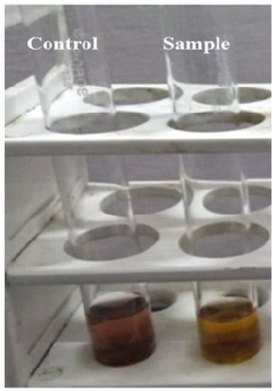 The free RSA of the dilute leaf extract of F. religiosa was tested using a 1,1-diphenyl-2-picryl hydrazyl (DPPH) technique. A total of 24 milligrams of DPPH were dissolved in 100 mL of methanol for making the stock solution. Filtration of DPPH stock solution using methanol yielded a usable mixture with an absorbance of around 0.973 at 517 nm. In a test tube, 3 mL DPPH workable solutions were combined with 100 µL of leaf extract. Three milliliters of solution containing DPPH in 100 µL of methanol is often given as a standard. After that, the tubes were kept in complete darkness for 30 min. The absorbance was therefore determined at 517 nm. The following formula was used to compute the percentage of antioxidants or RSA [19]: