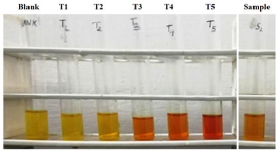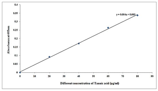 In the process, we put 20, 40, 60, and 80 g/mL of workable solutions of tannic acid from the standard inside four test tubes and then filled them with DL to make up the quantity of 5 mL. The empty test tube contains 5 mL of DL. In every test tube, make an addition of 2 mL of solution 1 and measure absorbance after 10 min. Determine the absorbance of each specimen at 605 nm using a spectrophotometer. With an empty solution, make the absorbance 0. Make a standardized graph of calibration by plotting a graph with dosage on the x-axis and absorbance on the y-axis. The slope value was applied to the graph, and then the quantity of tannic acid was calculated from an unknown specimen.