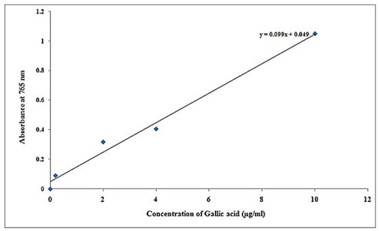 Standardized gallic acid (0, 0.2, 2, 4, 10 g/mL) was placed into sterile test tubes as part of the protocol. To obtain the amount to 500 µL, DL was added. For every test tube, apply 2.5 mL of Folin–Ciocalteu solution, followed by incubation for 5 min at normal temperature after thoroughly mixing the solutions. Within every test tube, apply 2 mL of 7.5% Na2CO3 and incubate for 1 h at room temperature. A spectrophotometer was used to determine the absorbance of every specimen at 765 nm. With an empty solution, adjust absorbance to 0. Establish the standard calibration graph by plotting a graph using protein content on the x-axis and absorbance on the y-axis. Applying the value of slope of the graph, determine the quantity of phenols within undetermined specimens.