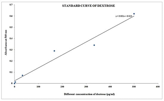 Table 9 shows the estimation of carbohydrates or reducing sugar with different specimen formulations by the DNS method and the color resemblance of reducing sugar estimation, showing darkening with increasing concentration of sugar concentration and absorbance of blank and standard solution dextrose at concentration of µg/mL) with a range of 0–499.95 in Table 10, and its respective plot shown in Figure 7 respectively. It is shown that concentration increases with respect to absorbance.
