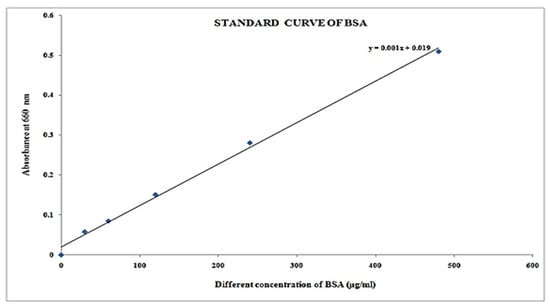 Standard BSA (0, 30, 60, 120, 240, and 480 μL) was placed in 5 thoroughly clean and dry test tubes and were labeled blank, T1, T2, T3, T4, and T5. To continue making the 1000 μL, DL was added. In another test tube, 25l μL of extract solution and 975 μL of DL were mixed and labeled. Every test tube contained 4.5 mL of solution 1 and was kept for around 10 min at room temperature. Every specimen solution was therefore filled with 500 μL of solution 2 and left to sit at room temperature for 30 min. Every test tube absorbance was measured using a spectrophotometer at 660 nm. A standard curve for proteins was plotted using the results of several standard solutions, and the protein content in unknown factors (extracted from samples) was approximated.