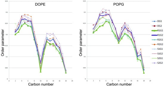 - Vermeer, L.S.; de Groot, B.L.; Réat, V.; Milon, A.; Czaplicki, J. Acyl Chain Order Parameter Profiles in Phospholipid Bilayers: Computation from Molecular Dynamics Simulations and Comparison with 2H NMR Experiments. Eur. Biophys. J. 2007, 36, 919–931. [Google Scholar] [CrossRef]