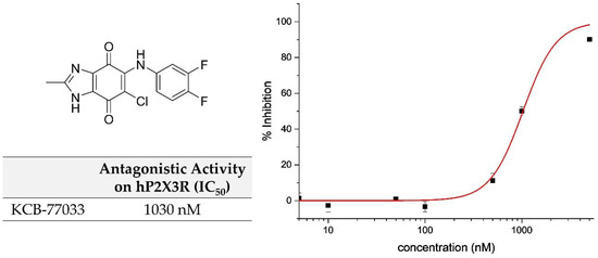 For the evaluation of P2XR activities, a cell-based assay system was employed to measure the level of fluorescence emission, based on Fluo-4 dye, during Ca2+ influx evoked by αβmeATP in HEK293 cells stably expressing hP2X2/3R and hP2X3R. The library containing 8364 representative compounds for the screening of antagonistic activity was provided by the Korea Chemical Bank. The antagonistic activities were evaluated in the presence of P2X3R agonist of the concentration for EC70 value (200–250 nM for hP2X3R and 1–4 μM for hP2X2/3R highly expressed cell lines), and AF353 was used as the positive control antagonist for comparison. For the first round of screening, a single concentration (25 μM) of each library compound was tested to identify initial hit compounds, which were subsequently validated using both concentrations of 25 and 10 μM. Using a cut-off threshold of higher than 50% antagonistic activity and after confirming dose-dependency, 12 main hit compounds were selected. Among them, a benzimidazole-4,7-dione analogue (KCB-77033, Figure 2) with an IC50 value of 1030 nM was finally discovered as the hit compound satisfying several factors such as having good antagonistic activity, a novel scaffold as a P2X3R antagonist, and affordability for studying SAR after further screening of benzimidazole-4,7-dione-related derivatives from the Korea Chemical Bank.