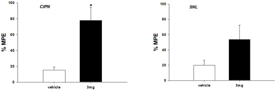 The antiallodynic effect of compound 14h was measured by counting the paw withdrawal responses to von Frey filaments in SNL and CIPN rats. Data are expressed as the maximal possible effect (% MPE). Each bar represents the mean ± SEM of five rats. * p < 0.05, compared with vehicle. Intravenous injection of compound 14h (12 mg/kg) significantly attenuated mechanical allodynia in rats with the neuropathic pain and, hence, increased paw withdrawal threshold in CIPN rats but not SNL rats compared to the controls. The maximum possible effects of 14h in CIPN and SNL rats were 78% and 54%, respectively (Figure 5).