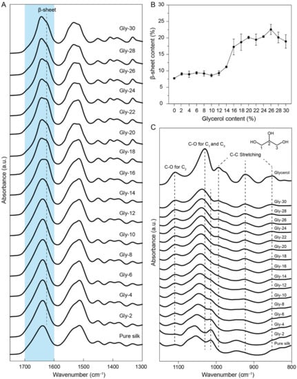 (A) FTIR spectra of the glycerol-plasticized silk films with highlighted amide Ⅰ region. (B) β-sheet contents of the glycerol-plasticized silk films estimated from the deconvolution of the amide I region. Three FTIR spectra were collected for each sample and spectral deconvolution was performed to estimate the β-sheet contents. (C) FTIR spectra of the glycerol-plasticized silk films and glycerol with a spectral region of 800–1150 cm−1.