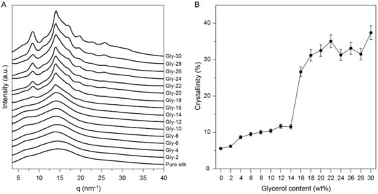 X-ray diffraction (XRD) was used to characterize the crystalline state of the glycerol-plasticized silk films, and the results are shown in Figure 2. At low glycerol contents (<12%), the plasticized silk films showed similar broad peaks as the pure silk film, which indicated that the materials predominantly present amorphous structures with low crystallinities. At a glycerol content of 16%, sharp peaks with q values of 8.5 and 14.1 nm−1 were detected (Figure 2A). With further increase of the glycerol content, more peaks were detected. These results indicated that the crystallization was greatly induced at a glycerol content over 16%. The deconvolution of the XRD profiles were performed to estimate the crystallinities of the glycerol-plasticized silk films (Figure 2B and Figure S3). Briefly, the peaks used in the deconvolution include crystalline components (6.6 nm−1, 8.5 nm−1, 14.1 nm−1, 14.7 nm−1, 17.3 nm−1, 19.8 nm−1, 22.7 nm−1, 26 nm−1, 28.1 nm−1, 30.5 nm−1) and amorphous components (~15.0 nm−1, ~28.0 nm−1). The deconvolution results showed that the crystallinities of the films were ~10% at low glycerol contents (<12%). However, a significant increase of crystallinity was observed for the films containing 16% glycerol, showing a crystallinity of 27 %. At higher glycerol contents (>16%), the crystallinities of the films were primarily in the range of 30–35%. These results agreed well with the FTIR results, demonstrating the significant change of molecular structures at a glycerol content ~14–18%. Based on the FTIR and XRD results, the molecular structures of the silk proteins and the interactions between glycerol and the silk proteins during the film fabrication process can be partially elucidated. At a low glycerol content (<12%), glycerol molecules primarily interact with the hydroxyl groups in the silk proteins via hydrogen bonding, leading to the disruption of the intermolecular interactions between protein chains and the promotion of the chain mobility (plasticization) in the amorphous domains. Such plasticization is not sufficient to promote the formation of β-sheet structures during the drying process (25 °C, RH 60%) until the glycerol content reaches ~14%. As the glycerol content surpasses 14%, more β-sheet structures are induced, but remain less compared to the silk films treated with methanol [29]. XRD results show that both the silk I and silk II structures are present in the films where the silk I structure is predominant [30]. It is known that the silk I structure is composed primarily of helical or turn structures [29,30], so the overall β-sheet contents for the films with over 14% glycerol are relatively less compared with silk materials presenting predominate silk II structure.