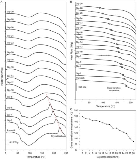 After the removal of water, a glass transition temperature (Tg) of 178 °C was observed in the second scan of DSC curves for the pure silk film (Figure 3B), which is consistent with previous reports [31,32]. As the glycerol content increased, the Tg of the films presented a decreasing trend, indicating the increase of the mobility of the silk protein chains in the amorphous domains. The glycerol molecules penetrate the amorphous domains and thus decrease the interactions between silk protein chains. As shown in Figure 3C, the Tg of the film with glycerol content of 30% was detected around 90 °C, which is significantly lower than the Tg of the pure silk film.