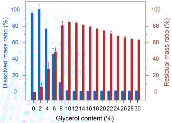 The water solubility of the glycerol-plasticized silk films was evaluated by UV-Vis spectrophotometry due to the absorption of the tyrosine residue in the silk proteins (~280 nm) [21]. Briefly, the silk films were cut into approximately 10 × 10 mm2 pieces and weighed. The mass was noted as m1. The film pieces were then incubated in 10 mL DI water at 37 °C with a shaking rate of 50 rpm for 24 h. After incubation, the film pieces were dried in an oven and weighed. The mass was noted as m2. The residual mass ratio of the films was calculated by the following equation:
