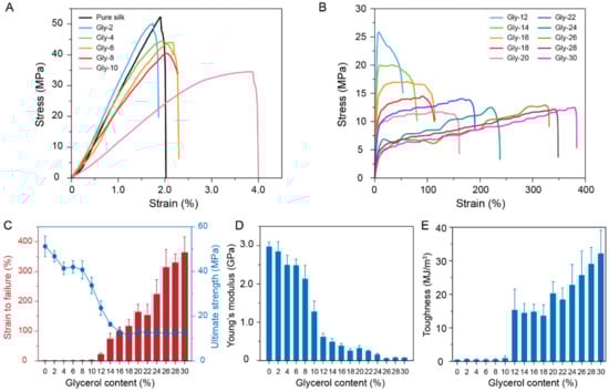 The mechanical properties of the glycerol-plasticized silk films were characterized by tensile testing. The representative strain-stress curves of the films are shown in Figure 5 and the results were summarized in Table 1. At low glycerol contents (<12%), the films were brittle with failure strains less than 3% and Young’s modulus around 2.5 GPa (Figure 5C,D) [23,34]. At this stage, glycerol is not enough to effectively disrupt the interactions between silk protein chains, leading to the limited promotion of the chain mobility. As the glycerol content increased over 12%, the films showed distinct plastic deformation (Figure 5B), indicating the enhancement of the chain mobility. The failure strain increased up to around 360% at the glycerol content of 30%. This result indicated that the glycerol located in the amorphous domains could enhance the mobility of silk protein chains effectively when the glycerol content was greater than 12%. Regarding the ultimate strength, it showed a clear decrease from 51.26 ± 4.61 MPa to 13.10 ± 1.50 MPa as the glycerol content increased from 0 to 16%. However, the ultimate strength did not decrease significantly as the glycerol content continued to increase. This trend is due to the dynamic interactions between the silk proteins and the glycerol, and the conformation change of the silk proteins. Specifically, at a low glycerol content, glycerol is capable of penetrating silk protein chains and breaking the initial hydrogen bonds formed between the silk protein chains (plasticization), resulting in the decrease of ultimate strength. However, as the glycerol content increased over 16%, the crystallinity of the films increased correspondingly and reached a plateau. Meanwhile, the glycerol for interfering the hydrogen bonding between the silk protein chains was saturated in the amorphous domains of the materials. Therefore, the ultimate strength is primarily determined by the crystallinity of the film at a relatively higher glycerol content. The Young’s modulus of the films showed a decreasing trend as the glycerol content increased (Figure 5D). However, the toughness of the films showed significant increase at a glycerol content of 12% (Figure 5E), which is attributed to the increase of failure strain. At this point, the plasticity of the films was greatly enhanced.