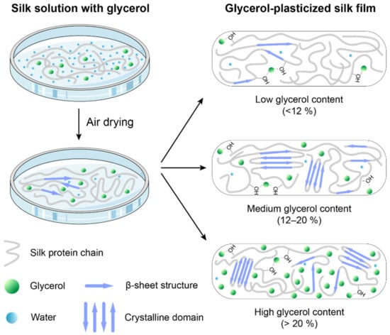 With the global trend of achieving carbon neutrality to mitigate the effects of climate change, the promotion of natural protein-based materials as an alternative to petroleum-based materials is attracting increasing attention in the food, healthcare, and packaging industries [1,2,3,4]. Silk proteins derived from silkworm cocoons have been studied and widely used in recent years due to their excellent mechanical properties, good biocompatibility, and aqueous-based preparation process [5,6,7,8,9,10,11,12]. Silk proteins can be processed into different materials such as films, hydrogels, and sponges to satisfy the needs of various applications [13,14,15,16]. Regarding silk material processing, some plasticizers, including polyols and lipids, have been used to tune the physical properties of the materials, where the plasticization leads to structural changes of the materials and softening of the brittle materials in the glass state [17,18,19]. Previous studies have shown that glycerol is an excellent plasticizer to regulate the protein structures and mechanical properties of silk materials. Specifically, the addition of glycerol can induce β-sheet structures and increase the stretchability of the silk films [20,21,22]. Brown et al. proposed that glycerol may simultaneously induce and interfere with β-sheet formation in silk materials, causing some improper folding that results in less-organized silk II structures even after the glycerol is removed [22]. These studies provide some understanding of the plasticization effect of glycerol in silk materials, as well as the interactions between glycerol and silk proteins. However, a clear understanding of processing-structure-properties relationships is still lacking, particularly for the glycerol-plasticized silk film with a relatively low glycerol content (<12%).