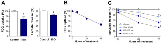 These results demonstrate that the cytotoxic effect of ISO is preceded by decreases in glucose uptake and lactate production, consistent with suppression of glycolytic metabolism.