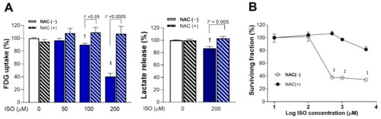 Scavenging of ROS with 1 mM NAC completely reversed ISO-induced suppression of glucose uptake and lactate production. Hence, glucose uptake that was decreased by 100 and 200 μM of ISO to 89.8 ± 2.4% (p < 0.005) and 40.3 ± 4.8% of that of controls (p < 0.0001) was recovered by NAC to 109.2 ± 7.4% and 107.0 ± 11.6% of controls, respectively (p < 0.05 and p < 0.0005, compared to absence of NAC; Figure 3A). Similarly, lactate production that was decreased to 87.0 ± 2.9% of that of controls (p < 0.005) by 200 μM ISO was recovered to 102.9 ± 3.3% of controls in the presence of NAC (p = 0.005, compared to absence of NAC; Figure 3A).