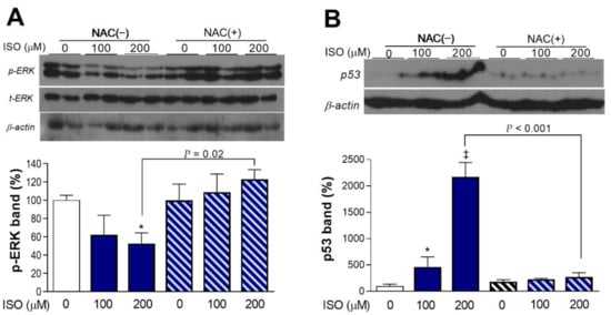 ISO stimulates ERK activation and p53 expression in an ROS-dependent manner. Western blots of activated ERK (p-ERK1/2; (A)) and p53 (B) of differentiated H9C2 cells exposure to 100 or 200 μM ISO for 24 h in the absence or presence of 1 mM NAC. * p < 0.05; ‡ p < 0.001 compared with untreated controls. Band intensities were normalized by total ERK for p-ERK and β-actin for p53. Bars are the mean ± SE of values obtained from two independent experiments (B; a total of four samples per group) or the mean ± SD of values from a single representative experiment (A; two samples per group) relative to that of controls.