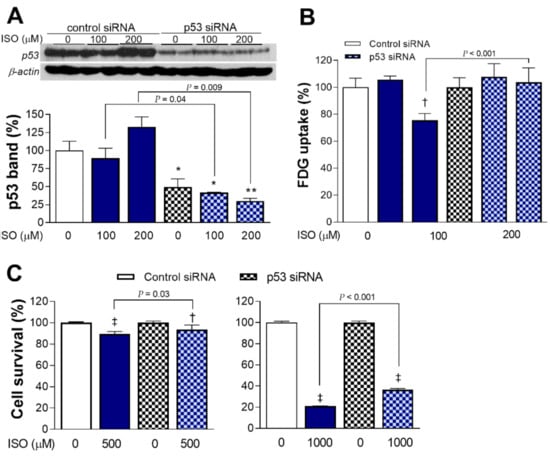 H9C2 cells silenced of p53 expression showed survivals of 93.6 ± 4.2% and 36.5 ± 1.1% after exposure to 0.5 and 1 mM of ISO, respectively, which was improved compared to survivals of 89.5 ± 2.4% (p < 0.05) and 21.0 ± 0.4% (p < 0.001), respectively, for cells transfected with control siRNA (Figure 5C). This represents a significant reversal of ISO cytotoxicity by p53 silencing.