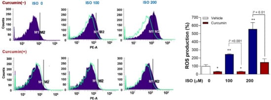Curcumin completely reverses stimulation of mitochondrial ROS production by ISO. FACS analysis of mitochondrial ROS based on MitoSOX Red in differentiated H9C2 cells (left) and quantified relative proportion of positive cells (right). Cells were exposed to 0, 100, or 200 μM of ISO for 24 h in the absence or presence of 2.5 µM curcumin. Bars indicate the mean ± SD relative to that of controls obtained from duplicate samples. * p < 0.05; ** p < 0.01 compared to untreated controls.