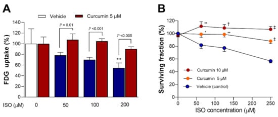 The dose-dependent lowering of glucose uptake by ISO was significantly recovered by curcumin (p < 0.01, p < 0.001, and p < 0.005 compared to cells exposed to 50, 100, and 200 µM ISO without curcumin) (Figure 8A).