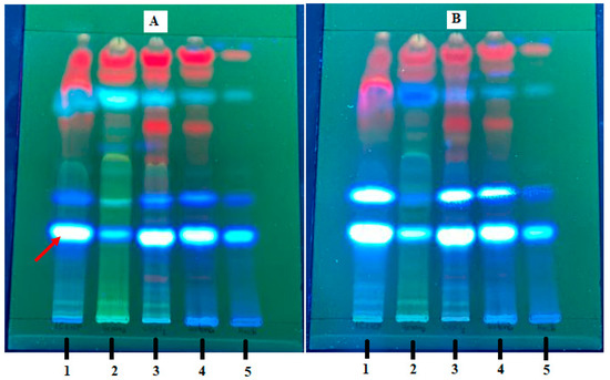 Figure 1 shows the thin-layer chromatography (TLC) analysis of the samples reported in Table 2. Each column numbered from 1 to 5 corresponds to a different sample, which moves from bottom to top with the mobile phase, allowing the separation of the compounds. Sample 1 is the original extract, and fractions 2–5 correspond to secondary fractions obtained with different solvents from a chromatographic column of the original ethanolic extract. TLC facilitated the separation of most of the compounds present in each evaluated sample. The TLC plate was visualized with ultraviolet light at a wavelength of 365 nm, and the absorption at these wavelengths indicates the presence of aromatic rings and/or conjugated double bonds in the structure of the metabolite. The band marked with the red arrow in Figure 1A indicates the presence of a metabolite with functional groups similar to those mentioned above. As the band intensity increased (Figure 1B) by spraying the plate with a base, such as KOH, the metabolite is highly probable to be a coumarin. Based on this information, we predicted that the secondary metabolites present in the samples run on this plate are very similar in terms of their chemical structure, and that at least two are coumarins.
