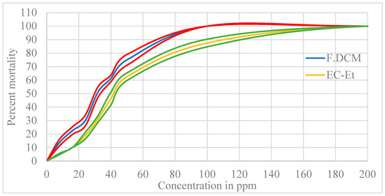 Observed percent mortality according to the sample concentration for the F.DCM and CE-Et shown in blue and yellow, respectively; the red and green lines indicate the expected mortality at the 95% CI.