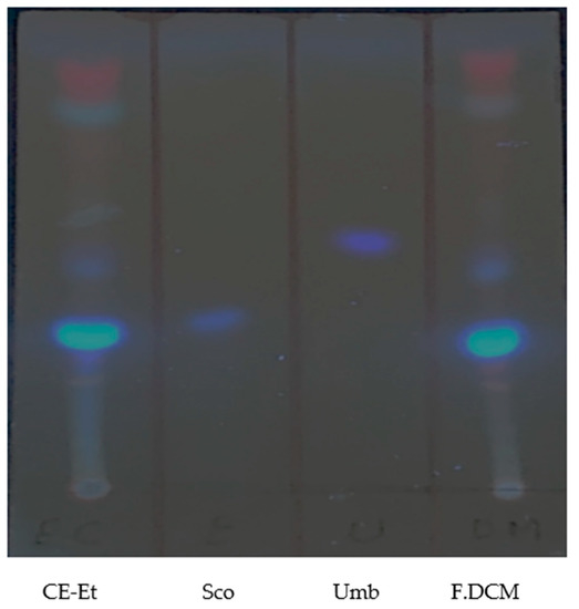 TLC plate eluted with toluene:ether (1:1) saturated with 10% acetic acid and developed with 5% KOH in ethanol; CE-Et—crude extract in ethanol; Sco—scopoletin standard; Umb—umbelliferone standard; F.DCM—dichloromethane secondary fraction.