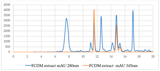 Figure 4 shows the high-performance liquid chromatography (HPLC) chromatograms, recorded at 2 wavelengths: 280 nm, typical for molecules with aromatic rings, and 343 nm, which exclusively detects a few secondary metabolites, including coumarins. Each peak in the chromatogram represents a compound, indicating that the F.DCM consists of relatively few compounds, three of which are potentially coumarins.