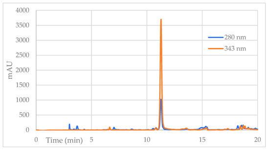 Reverse-phase HPLC-DAD chromatogram of the first purified compound at 2 wavelengths, 280 nm and 343 nm.