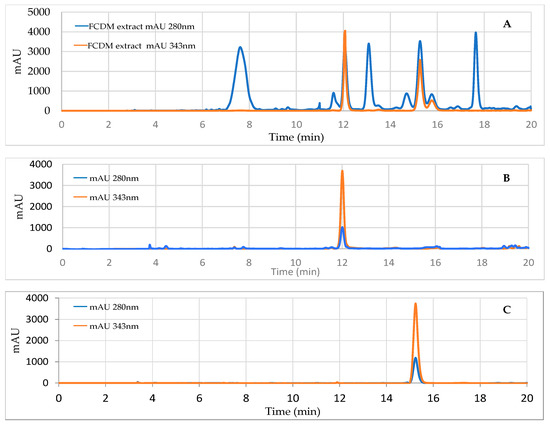 Reverse-phase HPLC-DAD chromatogram of the active F.DCM (A), scopoletin standard (B), and umbelliferone standard (C), at 2 wavelengths, 280 and 343 nm.