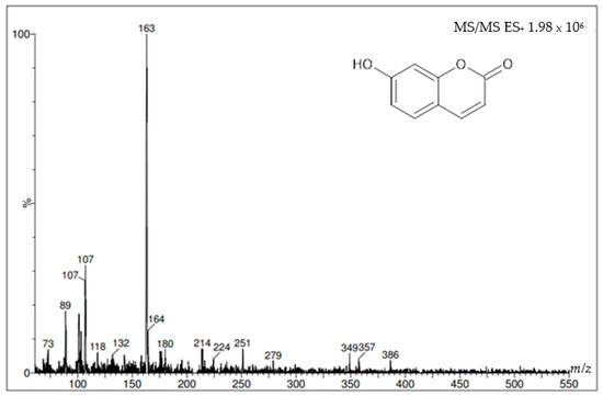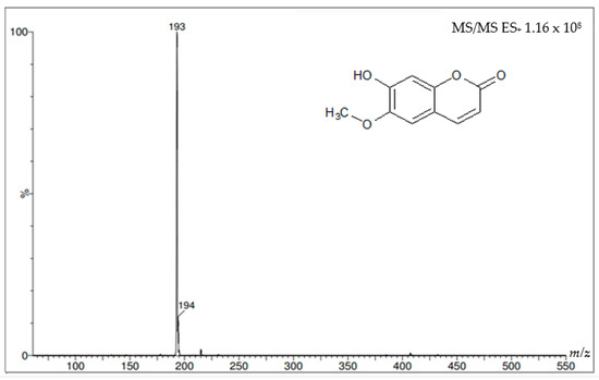 Figure 8 and Figure 9 show the mass spectra of the two coumarins obtained from I. cairica stems. The mass spectra of the molecular ion were generated using this analysis in positive mode, i.e., the molecular weight of the +1 molecule, which in some cases may generate a series of additional peaks corresponding to various molecular fragments, as shown in Figure 8. This same figure shows the molecular ion at m/z 163, which corresponds to the molecular weight of the coumarin umbelliferone +1. Figure 9 shows a molecular ion at m/z 193, which corresponds to the molecular weight of the coumarin scopoletin +1.