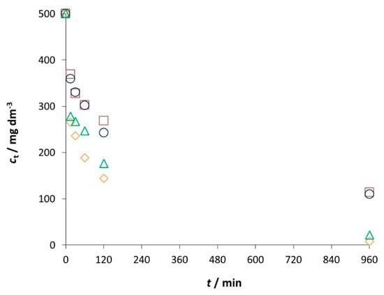The objective of this work was to evaluate the influence of initial pH value (pH0) on the treatment of dye-rich textile wastewaters by the adsorption process. For this study, we chose an RB5 dye concentration of c0 = 500 mg dm−3, which is a possible dye concentration in textile wastewaters. The amounts of adsorbed dye at time t (qt) for different initial pH values are given in Table 1, while the liquid phase dye concentrations (ct) during adsorption process are presented in Figure 1.